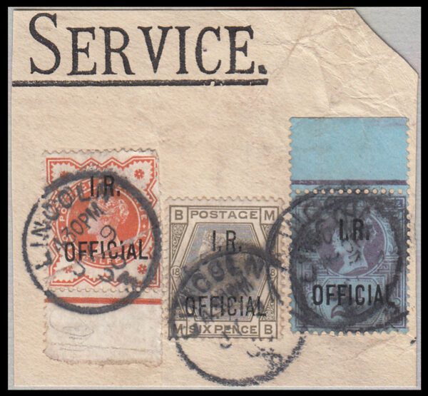 SGO13 1888 ½d. Vermilion. “I.R. OFFICIAL”. Used on blue O.H.M.S. envelope…