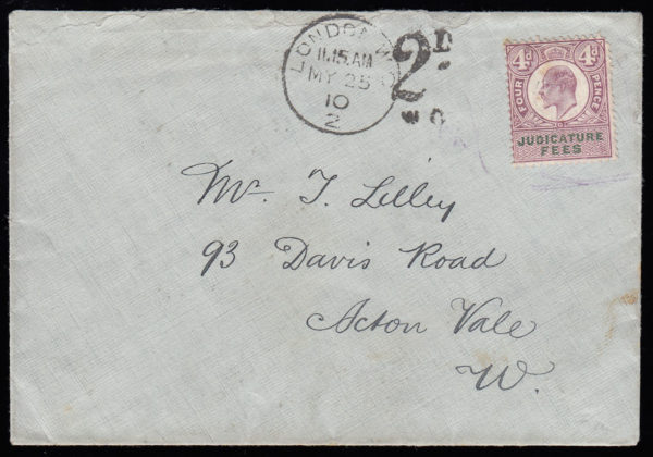 1910 EDVII Judicature Fee 4d. used on cover, but not accepted for postage.