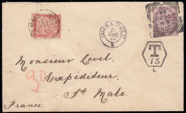 1885 20pf blue stamp on cover to Manchester, 23.JU.85. 498 duplex – blue “T” indicating Postage Due.