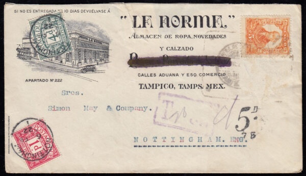 SGD2 and SGD6 1922 Underpaid advertising envelope from Tampico, Mexico to Nottingham.