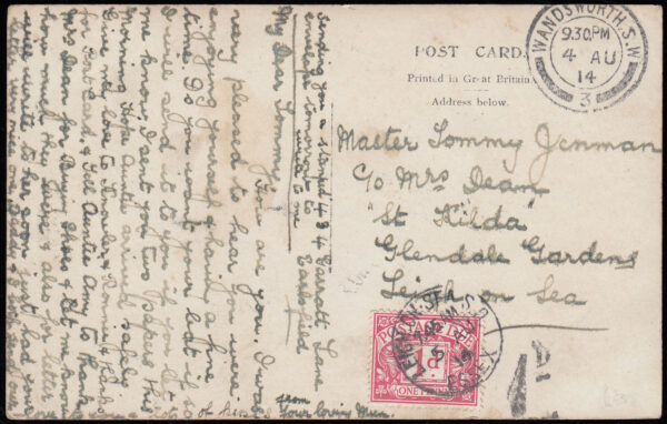 SGD2 W.W.I 1914 Postcard of Wandsworth Common, posted on AU.19.1914 – the day war was declared by Great Britain.