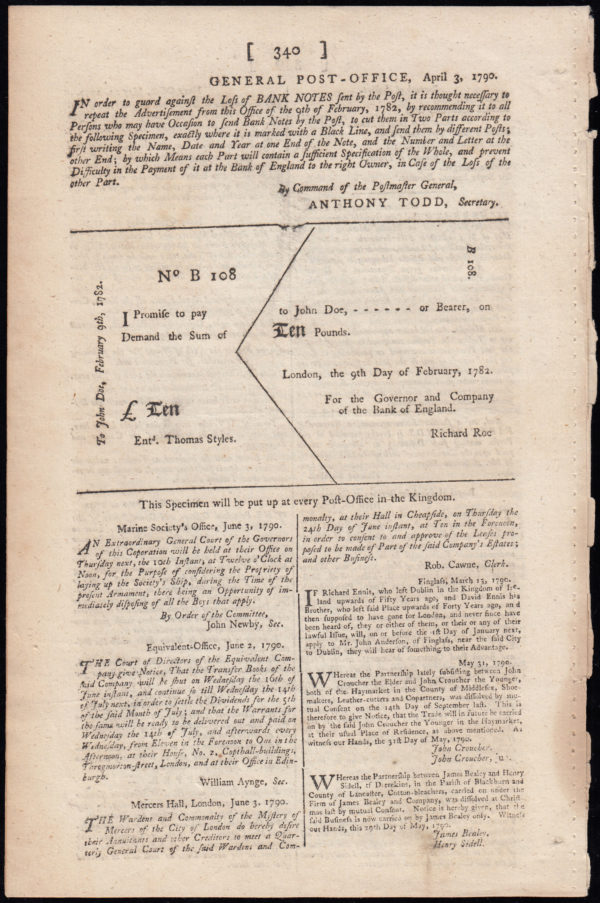 1790 Post Office Notice/ Registration: London Gazette.