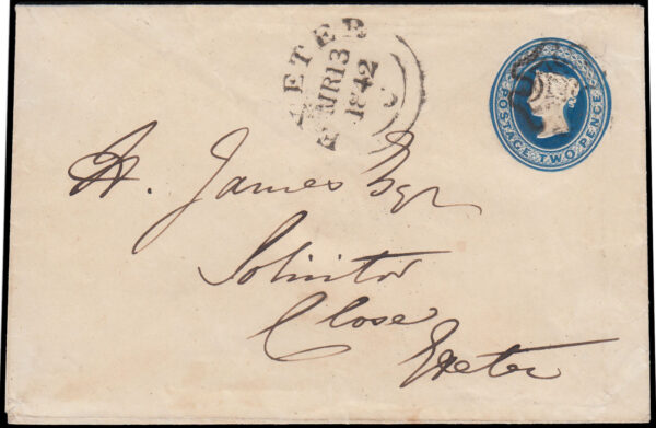1842 2d. Blue stationery envelope used locally in Exeter. An almost identical envelope is in the Phillips collection at the NPM.