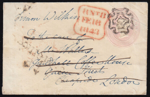 1843 1d. Pink envelope, No.11 in maltese cross to Cheltenham – “Post Office”.