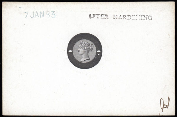 1882/ 1900 Minerva head die proof in black on glazed card, prepared for printing of this “dummy head”.