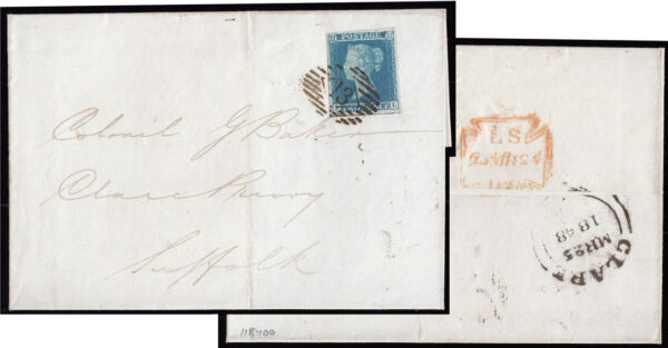 SG14 1841 2d. Blue Pl.3 (FL). Excellent wide margined example on wrapper from LONDON to CLARE, SUFFOLK cancelled by a crisp strike of the “13” Inland Office numeral.