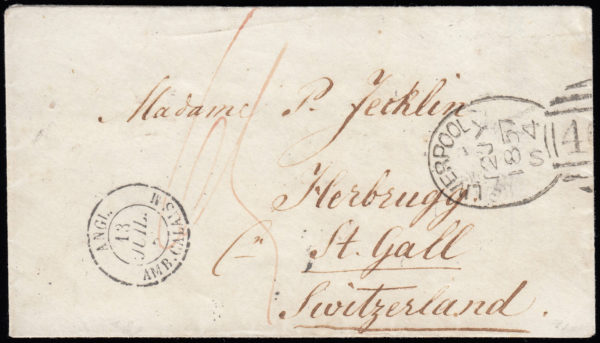 1857 Unpaid envelope to Switzerland, struck with LIVERPOOL Spoon type C4, re-cut.