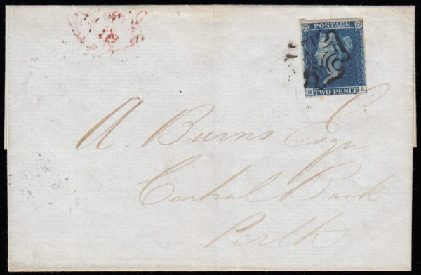 SG14 1841 2d. Blue, plate 3, RA on cover, London to Perth.