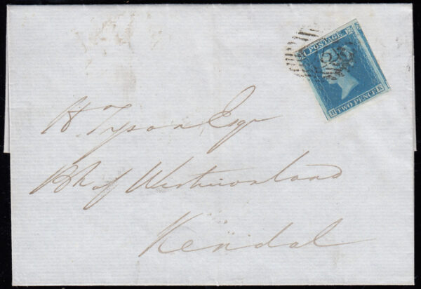 SG14 1841 2d. Blue, plate 3, HK- double letter; huge margined example on wrapper, London to Kendal.