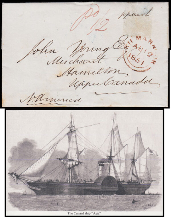 1851 Stampless cover Kilmarnock to Upper Canada, with the stamp becoming detached or removed!