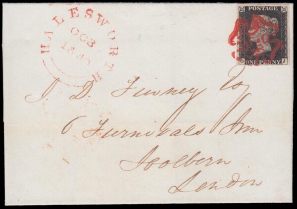 SG1 1840 1d. Intense black, plate 1b, OJ, sent from Halesworth to Holborn.
