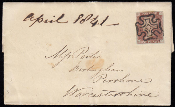 SG8 1841 1d. Red-brown “black plate 5”, DC, state 3 on entire from Moy to Pershore, Worcs.