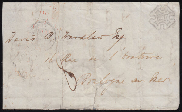 1844 Stampless cover to Boulogne, Italy, with a black Edinburgh special maltese cross.