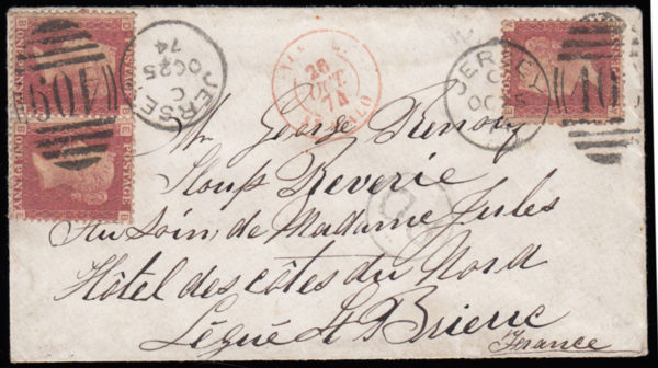 SG43 1872 1d. Rose-red, plate 154, on envelope JERSEY to ST. BRIEUE, FRANCE.