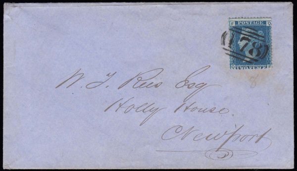 SG45 1860 2d. Blue, plate 8, QF, on neat cover from Chepstow “178”.