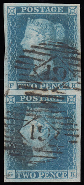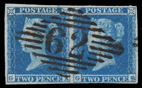SG14 1849 2d. Blue plate 4, GA-GB pair, with single 62 in diamond cancel of Belfast. Contrary to regulations.