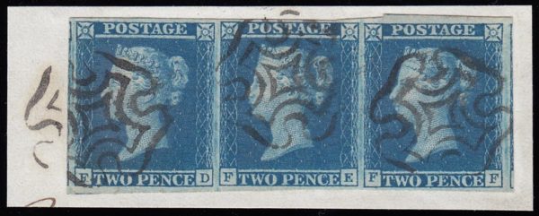 SG14 1841 2d. Blue, plate 3, FD-FF. Superb used strip of 3 on small piece.
