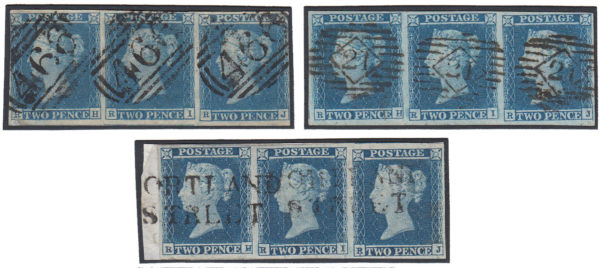 SG14 1841 2d. Blue, plates 3 and 4, matched trio, RH – RJ.