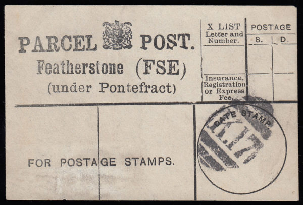 SG197/ SG214 c.1895 Parcel Post label. “Featherstone (under Pontefract)”.