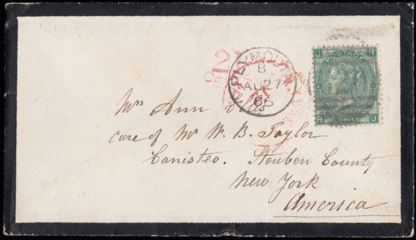 SG101 1865 1/- Green, plate 4, RJ (wmk Emblems) on mourning transatlantic envelope, Plymouth to New York.