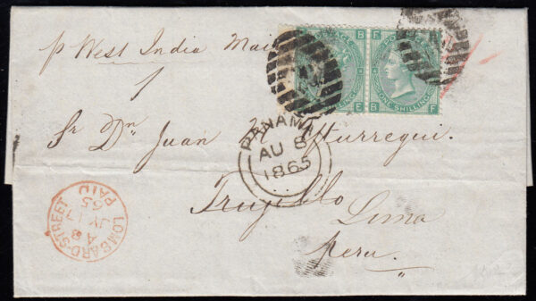 SG101 1865 1/- Green, plate 4 (Emblems) pair, BE-BF paying double rate. London to Peru via Panama.