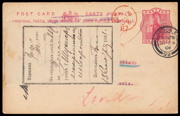 1899 1d. Red Postal Stationery Post Card. Sent from LONDON to WARSAW, RUSSIA…