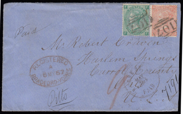 SG101 1867 Bradford (West Yorkshire), envelope sent Registered to Harlem Springs, Ohio, USA.