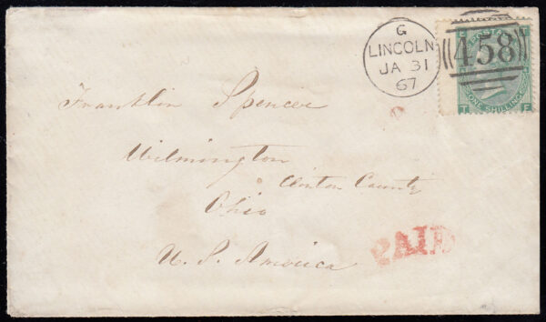 SG101 1867 1/- Green, plate 4, IE. Emblems watermark on neat cover, Lincoln to Ohio, USA.