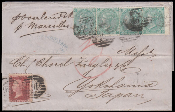 SG101 1867 Entire, London to Yokohama via Marseilles.