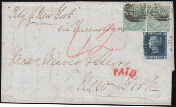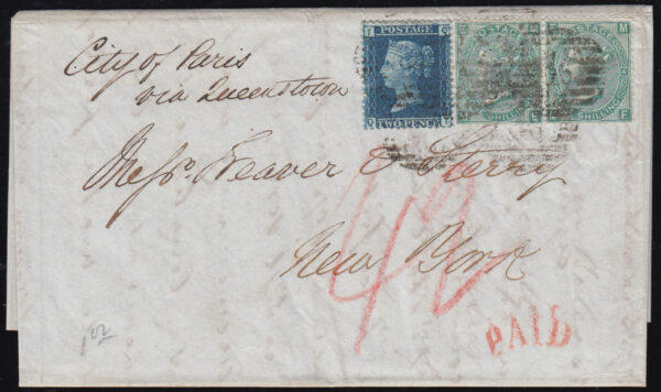 SG101 1866 1/- Green, plate 4, GD. Plus 2d. blue, plate 9, KD, on entire from London to New York, per “City of Paris” via Queenstown.