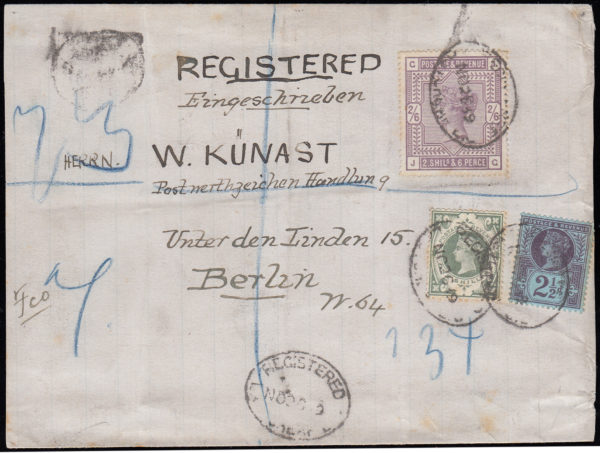 SG178 1889 Registered envelope, London to Berlin with rare use of the 2/6d.