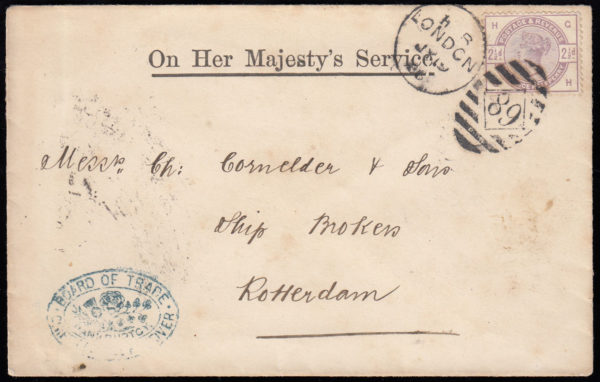 SG190 1883 2½d. Lilac on small cover, London to Rotterdam.