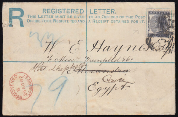 SG169 1882 5d. Indigo on Registered stationery envelope, London to Cairo, Egypt.