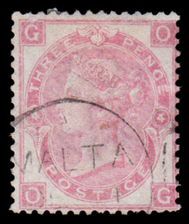 SG103 1867 3d. Rose Pl.4 (OG). Wmk. Spray. Cancelled by a neat MALTA c.d.s. Scarce plate – Cat. £300.