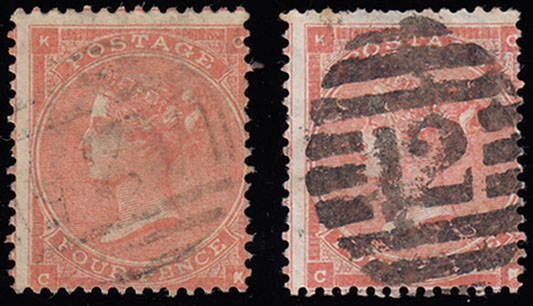 SG80 1862 4d. Pale-red, plate 3, CK, defective “K” at lower right. Two examples in different states.