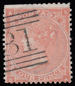 SG80 1862 4d. Pale-red, plate 3, BA, variety “lower case b”, sound used with Edinburgh numeral.