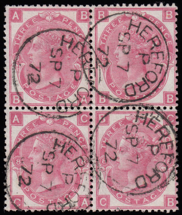 SG103 1872 3d. Rose, plate 8, BA-CB. Crisp HEREFORD cds cancels.