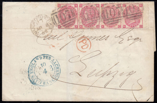 SG103 1868 3d. Rose, plate 4, watermark Spray of Rose, strip of 4, NA-ND, from Bradford to Leipzig.