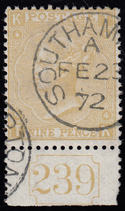 SG110 1867/ 80 9d. Straw, TK. Current number 239 in bottom margin.