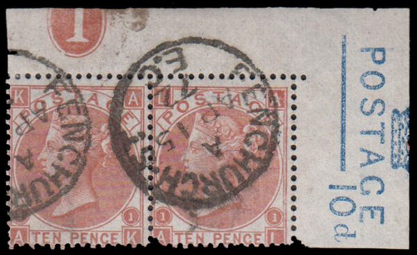 SG112 1867/ 80 10d. Red-brown, plate 1, AK-AL corner pair. Fenchurch Street cds.