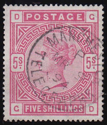 SG180 1883 5/- Rose, GD, very fine used Manchester Telegraphs cds.