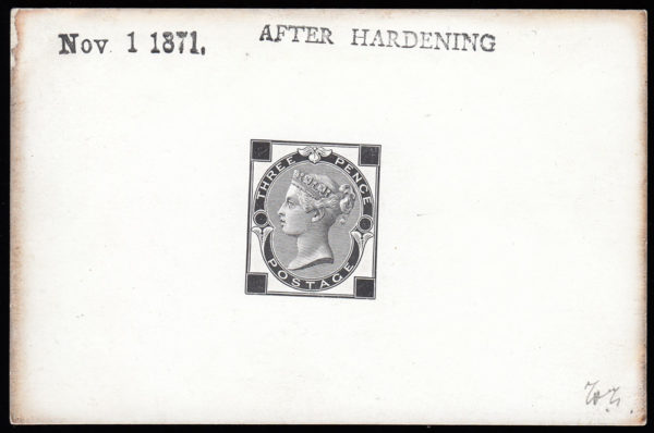 SG102 Proof 1871 3d. Die proof in black on glazed card, dated Nov.1.1871.