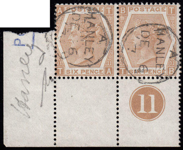 SG122a 1872 6d. Chestnut, plate 11, TA-TB. A brilliant cds corner pair showing plate number.