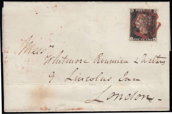 SG1 1840 1d. Intense black, plate 5, JE on wrapper from Glasgow to London.
