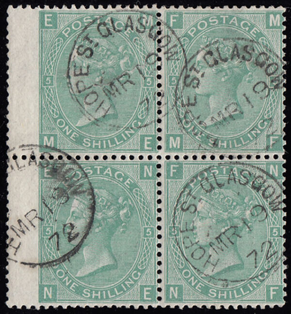 SG117 1872 1/- Green, plate 5, ME-NF. Very fine cds used block.