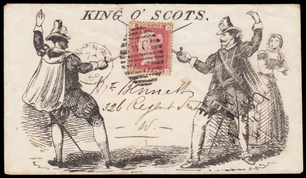 SG43 1866 1d. Rose-red Pl.102 (AI). Fabulous printed envelope depicting two duelling men in period dress inscribed “KING O’ SCOTS”.