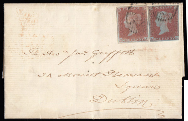 SG8 1852 1d. Plate 129, FJ, and plate 133, LL, on entire London to Dublin.