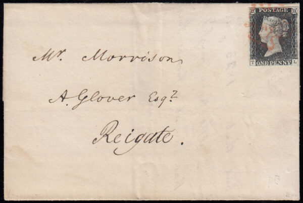 SG3 1840 1d. Grey-black plate 1a, TL, on bleute paper, London to Reigate.