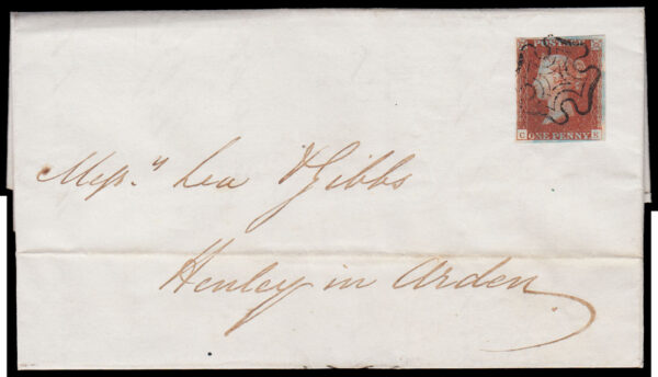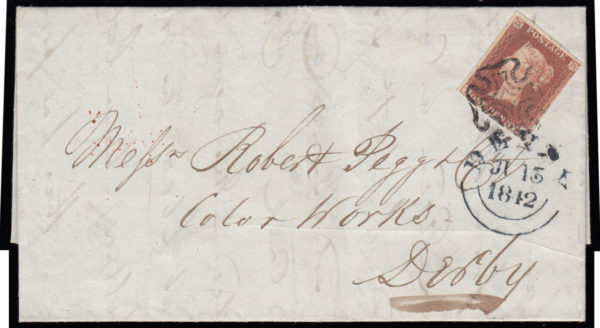 SG8 1842 1d. Red-brown pl. 20, JC, on cover from Exeter to Peckham, London.