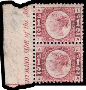 SG48 1879 ½d. Rose-red Pl.20 (IA – JA). Unused o.g. left marginal pair with inscription. Cat. £700+.